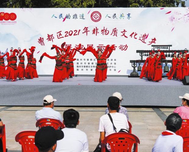 6月2日,曾都区2021非物质文化遗产展演在神农公园举行。该展演静态和动态相结合,展示了曾都区非物质文化遗产项目。图为编钟乐舞《随州神韵》。(随州日报全媒记者孙洪涛摄)