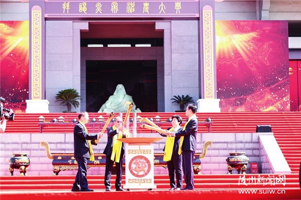6月6日,辛丑年世界华人炎帝故里寻根节开幕式暨拜祖大典上,“人民英雄”张定宇、全国脱贫攻坚楷模白晶莹、全国优秀共产党员吴天祥、中国工程院院士范维澄共同点燃圣火。(随州日报全媒记者李文军摄)