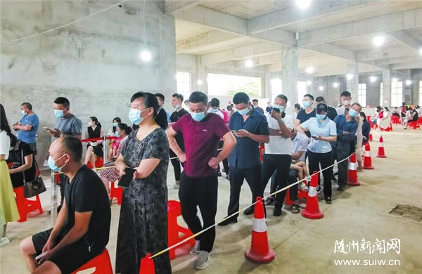 我市各地通过加强组织领导,强化宣传倡导,规范设置接种门诊,多措施推进新冠疫苗接种工作,城乡居民接种意愿高涨。图为6月10日,居民正在城南新区涢水社区接种点排队等候接种。(随州日报全媒记者李文军摄)