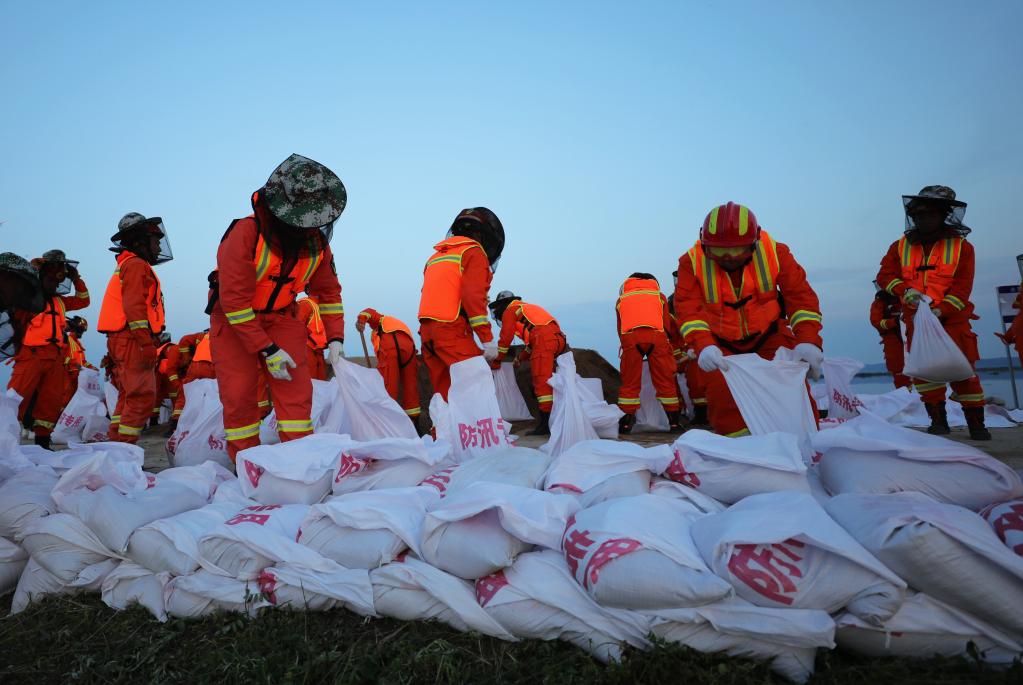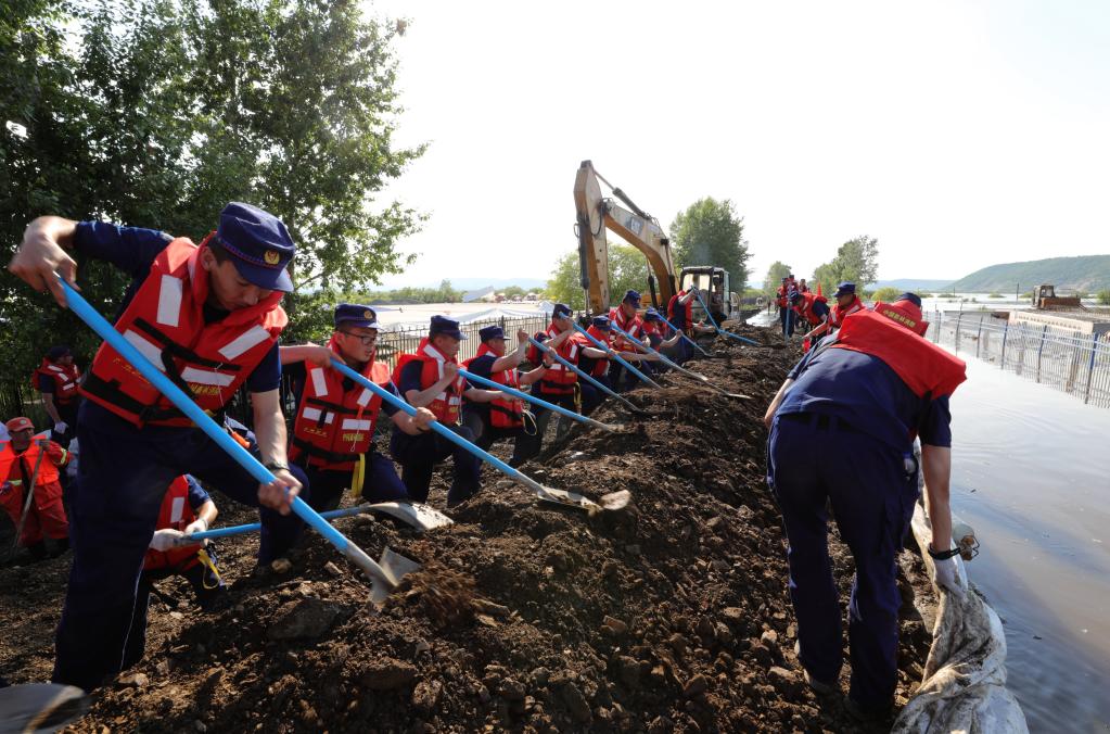 大兴安岭地区森林消防支队指战员在331国道抗洪一线加固堤坝抵御洪水。 (新华社记者马晓成 摄)