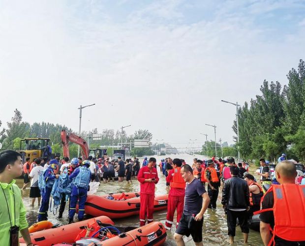 图为7月23日下午3时,随州蓝天救援队在河南省新乡市转移受灾群众和运送救灾物资。