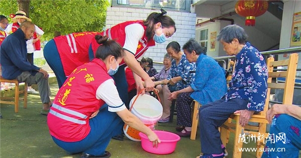 践行雷锋精神,传承敬老美德。7月22日,广水市新广福足道的志愿者到骆店镇福祥敬老院为50多位老人足疗修脚,为他们送去关爱与温暖。(随州日报通讯员张婷、夏菁、冯青摄)
