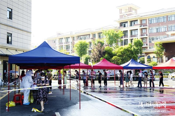 城南新区风光社区居委会严格防疫管控措施,连日来组织对从外地回家的社区居民进行核酸检测。图为8月6日,社区居民正在排队进行免费核酸检测。(随州日报全媒记者李文军摄)