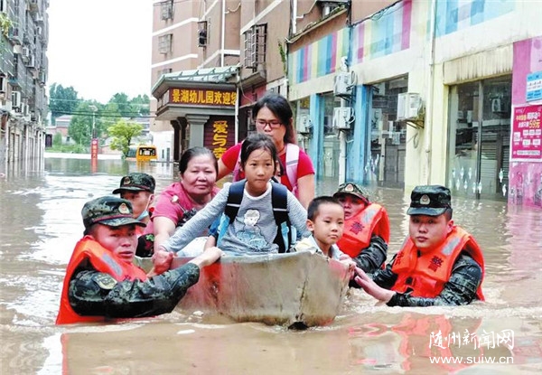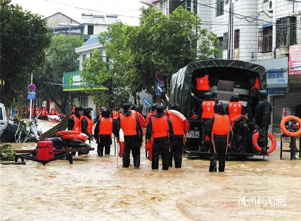 武警随州支队在曾都区何店镇救援。 (随州日报通讯员陈一帆摄)