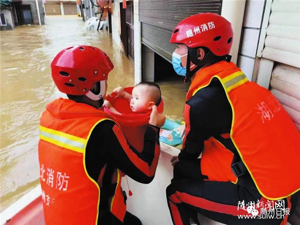 消防救援人员从危险地段转移出一名幼儿。(随州日报通讯员肖宣摄)