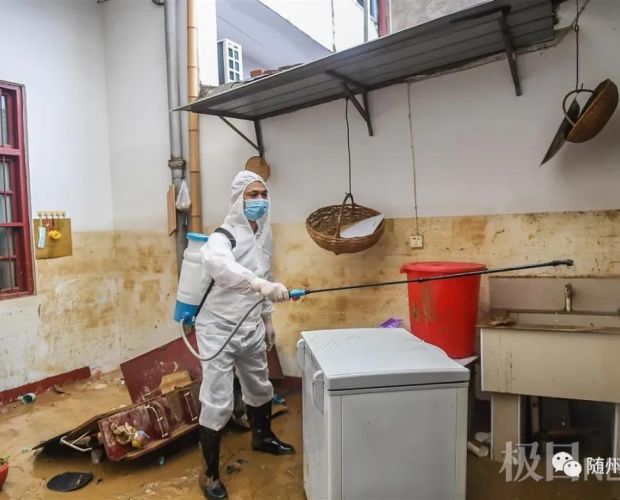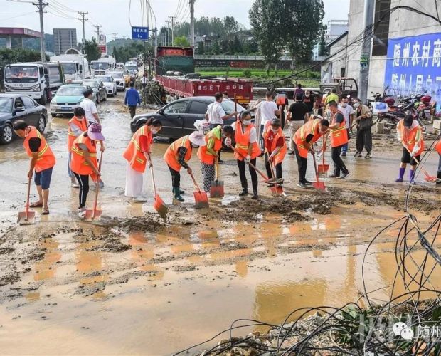橙色衣服的是环卫。下午,雨水已经停歇天已放晴,积水渐渐退去,街上的淤泥却越踩越多。一群橙色身影活跃在镇上小街。他们铲着淤泥,清洗着街道。这是随州市市容环卫局赶来增援的人马,局长罗艳亲自带队。