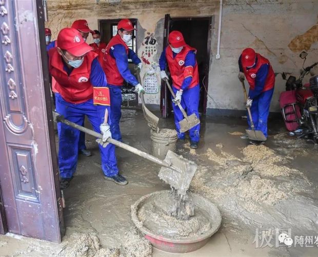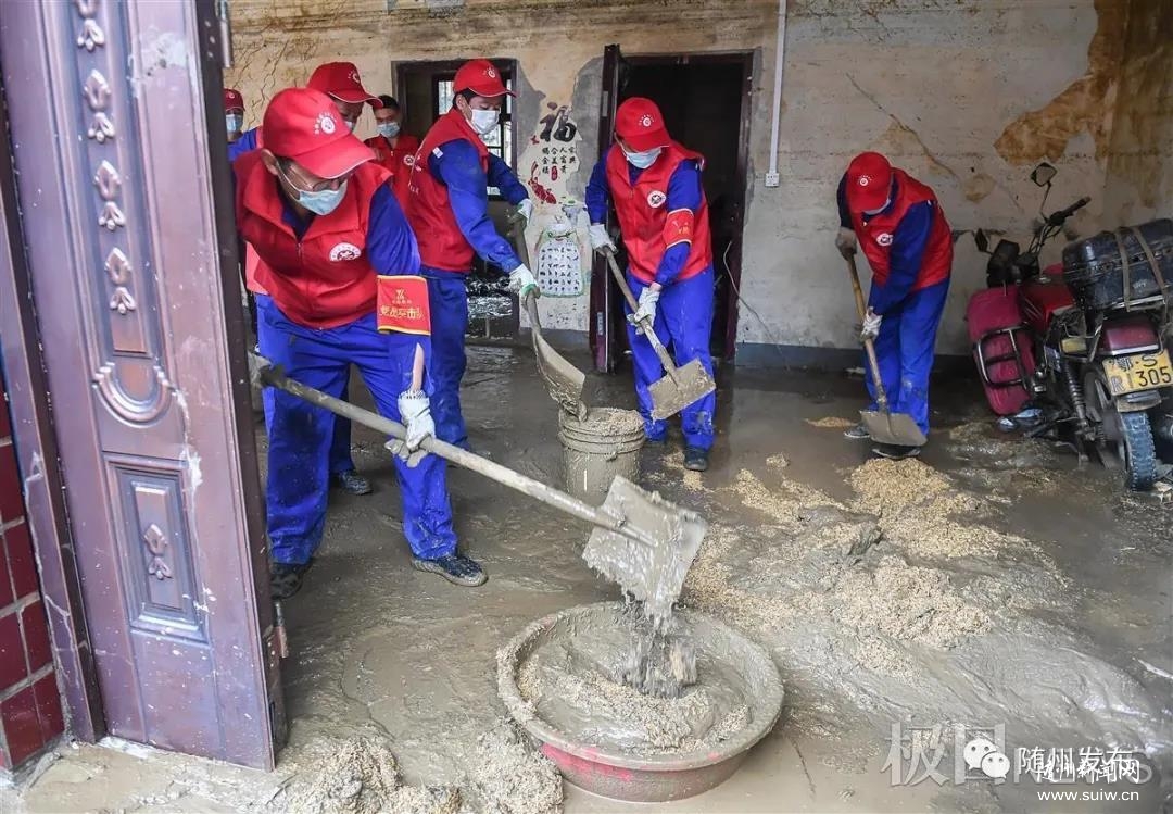 在一处民房前,一群身穿蓝色工装,外套红色马甲的人正帮这户居民清扫家里。带队的姜茂军是湖北新兴全力机械有限公司党办主任,也是这群志愿者队伍的领头人。他说,他们公司的前身原来就在柳林镇,老厂房现在还在。听说镇上百姓遭灾,特地赶来增援。除了带来物资外,还想帮帮老百姓。于是,大家就给居民家清扫屋子,记者采访时已经清理完7户。