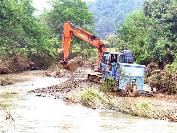 随县洪山镇武圣宫村对河道进行清理,抢修水毁道路。(随州日报全媒记者陈云摄)