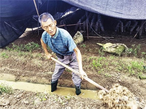 连日来,曾都区洛阳镇珠宝山村村民不等不靠,抗灾自救。图为8月15日,村民杨光义正在为自家的香菇大棚清沟排水。前几天的大水让他家的15000袋袋料香菇受损。杨光义说,只要自己干得动,就要自立更生,减少灾害带来的损失。 (随州日报全媒记者孙洪涛摄)