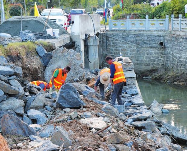 曾都区交通运输局抢抓晴好天气,组织对辖区内水毁公路设施摸排和修复,确保道路安全畅通。图为8月19日,工人正在对洛阳镇张畈村水毁公路挡墙进行修复。