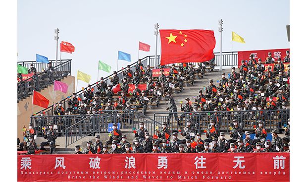 8月22日,“国际军事比赛-2021”中国库尔勒赛区在“苏沃洛夫突击”比赛场正式开幕,观赛官兵欢呼。张永进摄