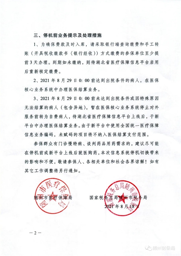 为进一步加强医疗保障信息化建设,按照国家和湖北省医疗保障局的统一部署,我市医保核心业务系统将统一切换到湖北省医疗保障信息平台,系统切换期间全市各级医保经办机构及定点医药机构的各项医保业务将暂停办理。