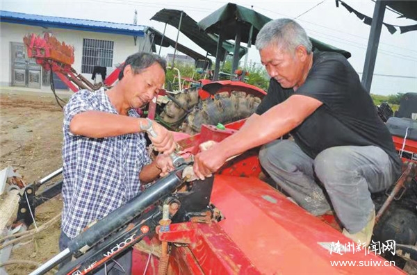 位于随县安居镇黄寨村的随县创丰种植专业合作社近3000亩稻谷丰收在望。图为工人们未雨绸缪,抢修农机,确保收割安全。(随州日报通讯员石守京摄)