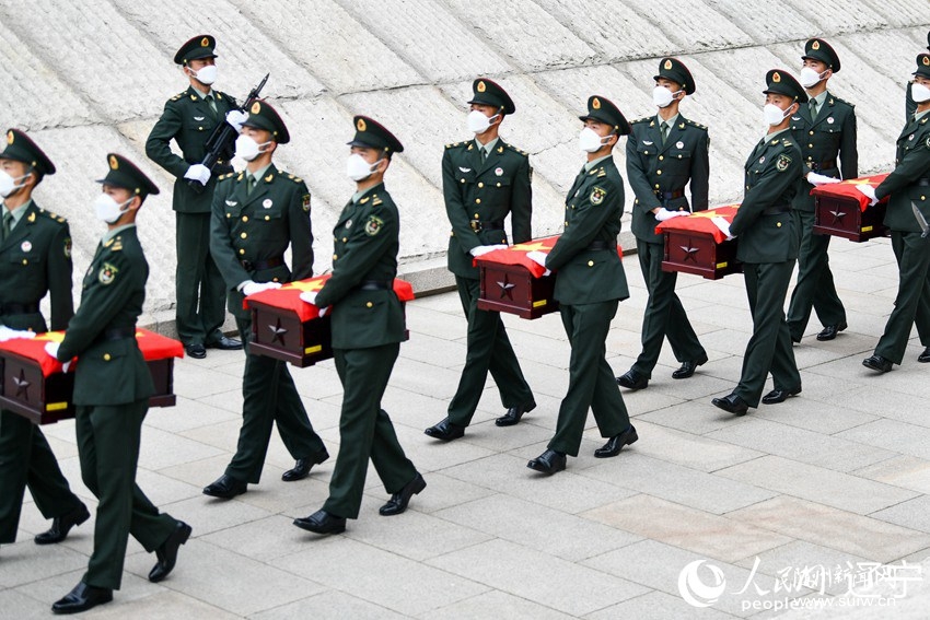 沈阳抗美援朝烈士陵园,翠柏葱郁、苍松肃立。铭刻着“抗美援朝烈士英灵永垂不朽”的纪念碑巍峨挺拔。安葬仪式在陵园下沉式纪念广场举行。环形的烈士英名墙下摆满了黄白相间的菊花。参加仪式的人们肃穆站立,缅怀英烈。