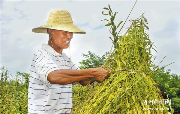 随县厉山镇神农社区小农场岗地黄豆、红苕、芝麻等旱秋作物长势良好喜获丰收。图为该镇农民趁晴下地收割芝麻。(随州日报全媒记者孙洪涛、通讯员葵琳、老木摄)