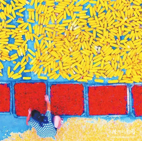 随县高城镇嵩垛村的辣椒红了、玉米熟了。该村流转50多亩土地种植辣椒,销售收入预计可达30万元。图为村民正在晾晒辣椒、玉米。(随州日报通讯员张玉国摄)