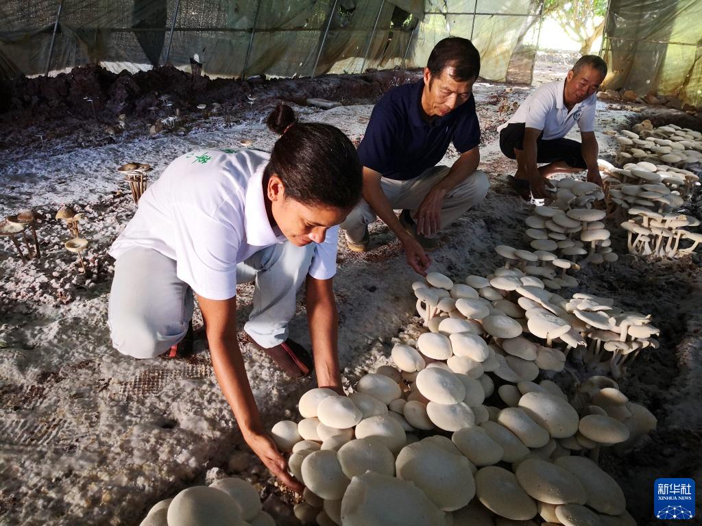2018年6月12日,在斐济楠迪,中国专家和当地雇员检查菌菇生长情况。中国援助的菌草技术示范中心项目于2014年引入斐济。新华社记者 张永兴 摄