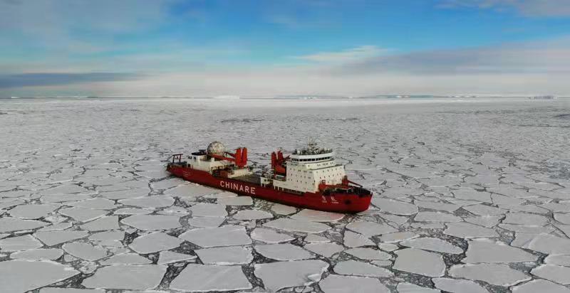 中国“雪龙”号极地考察破冰船在南极冰雪海洋前行