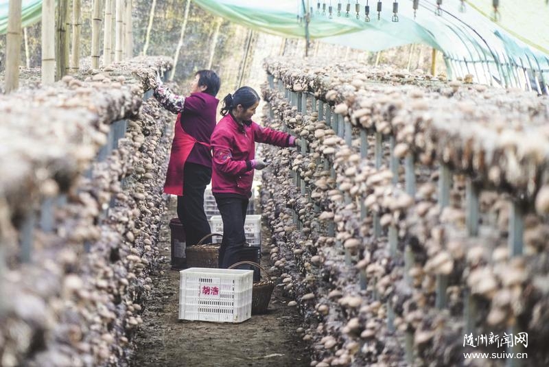 曾都区洛阳镇龚店村农民胡浩种植的3万袋袋料香菇日前迎来了收获季节。胡浩说,现在他们全家齐上阵,并请来帮手全力采摘,力争创收10万元。 (随州日报全媒记者孙洪涛摄)