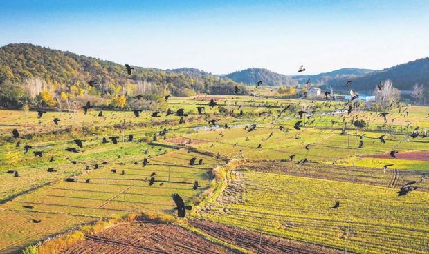 11月上旬,我市进入秋季候鸟迁徙高峰。图为成百上千只灰椋鸟正在曾都区洛阳镇胡家河村收割后的稻田间觅食嬉戏。今年由于我市鸟类栖息环境不断改善,途经我市迁徙落脚的候鸟品种、数量逐年增长。(随州日报全媒记者李文军摄)
