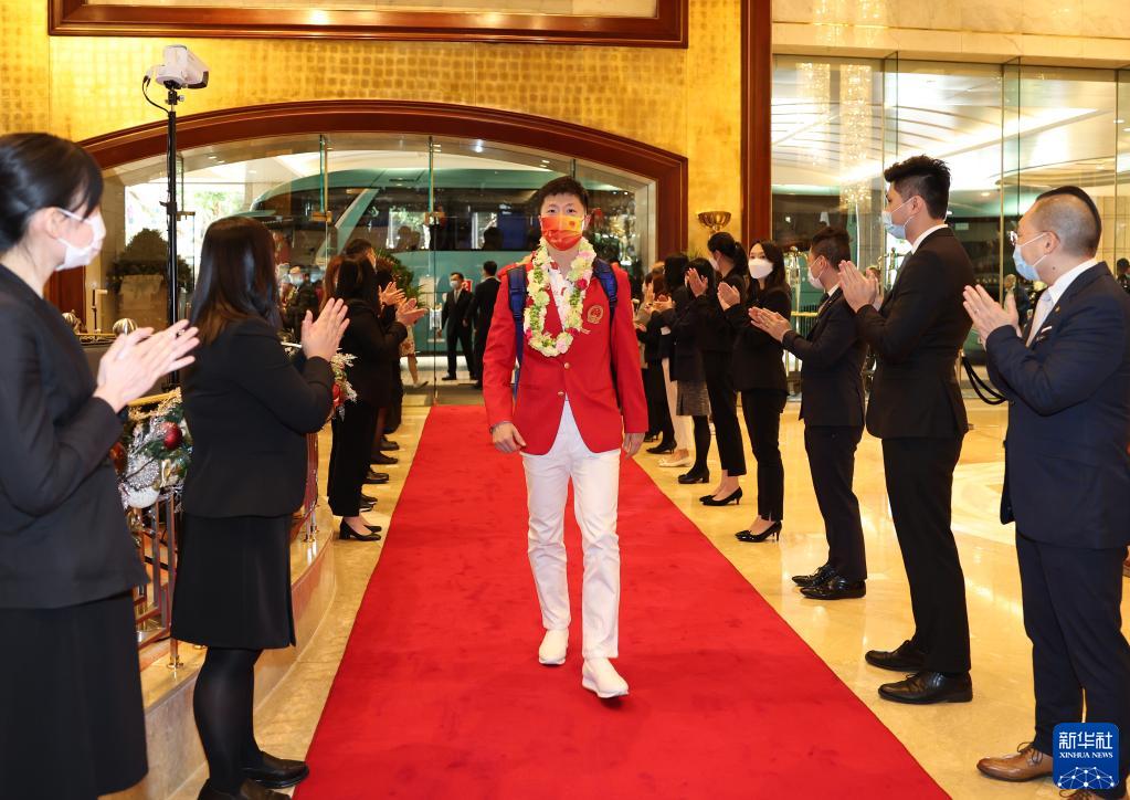 12月3日,东京奥运会女子铅球冠军巩立姣抵达香港海景嘉福酒店。新华社记者 贾浩成 摄