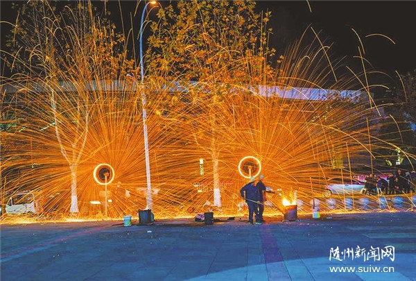 12月17日至19日晚,随州万达广场举行迎元旦“打铁花”表演活动。火红的铁汁被技师抛洒空中后,用木板拨散,形成璀璨绚丽的火树银花,为广大市民带来一场视觉盛宴。 (随州日报全媒记者李文军、通讯员高建新摄)