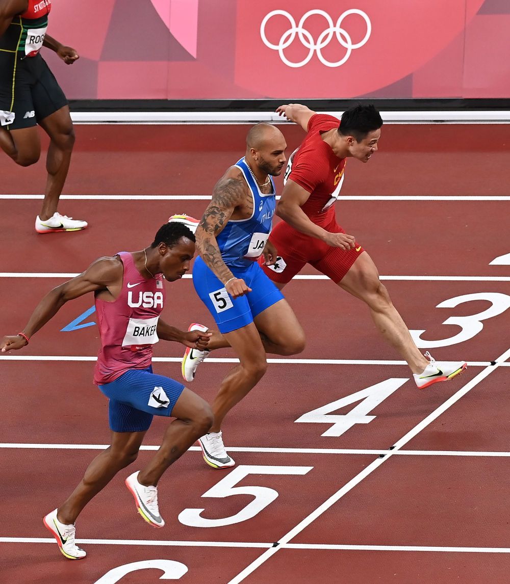 ↑2021年8月1日,东京奥运会田径男子100米半决赛在东京新国立竞技场举行。中国选手苏炳添(右一)跑出9秒83,以半决赛第一晋级决赛,同时创造了新的亚洲纪录。