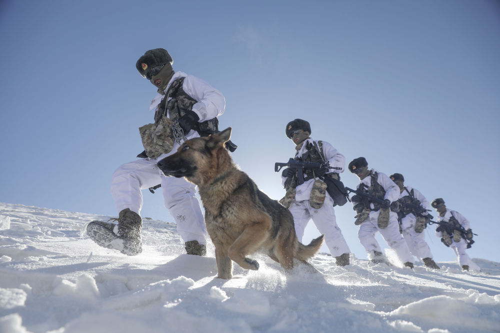 ↑2021年2月11日,驻守帕米尔高原的新疆喀什军分区某边防团托克满苏边防连官兵按计划对海拔5100米的山口实施例行巡逻。