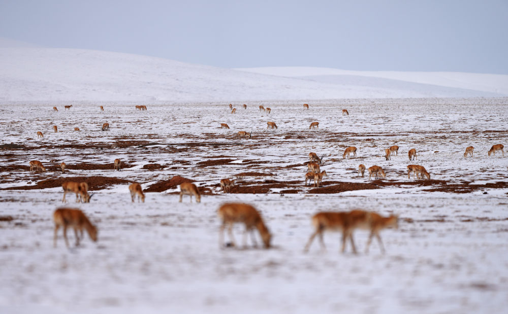 ↑2021年4月20日,在青海可可西里,一群正在迁徙的藏羚羊向卓乃湖方向行进。