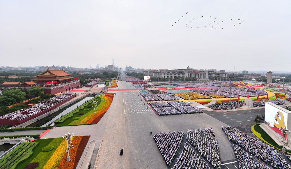 ↑2021年7月1日上午,庆祝中国共产党成立100周年大会在北京天安门广场隆重举行。这是飞行庆祝表演。
