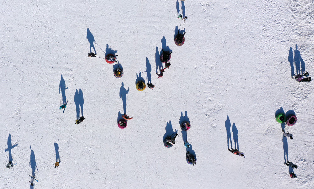↑2021年12月5日,游客在宁夏银川市鸣翠湖滑雪场体验雪上运动(无人机照片)。