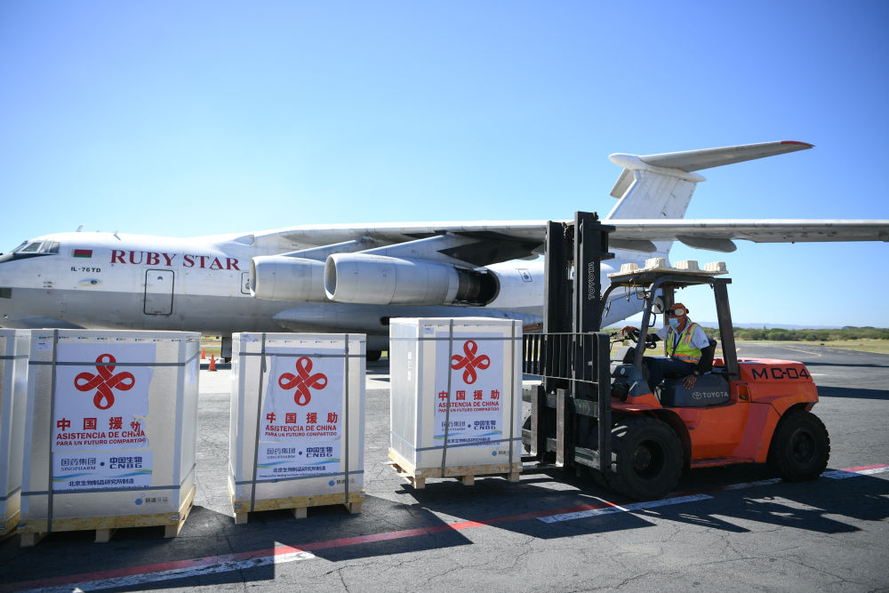 ↑2021年12月24日,在尼加拉瓜马那瓜国际机场,工作人员转运由中国国药集团生产的新冠疫苗。当日,中国政府提供的第二批新冠疫苗运抵马那瓜,助力当地开展疫苗接种计划。