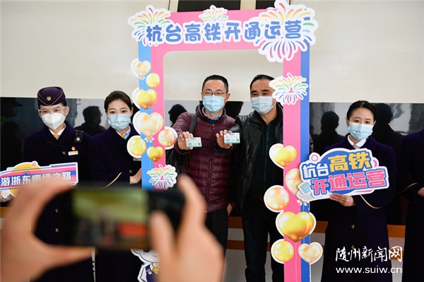 1月8日,乘坐杭台高铁首发列车的建设者代表在台州站站台留影。 新华社记者 黄宗治 摄