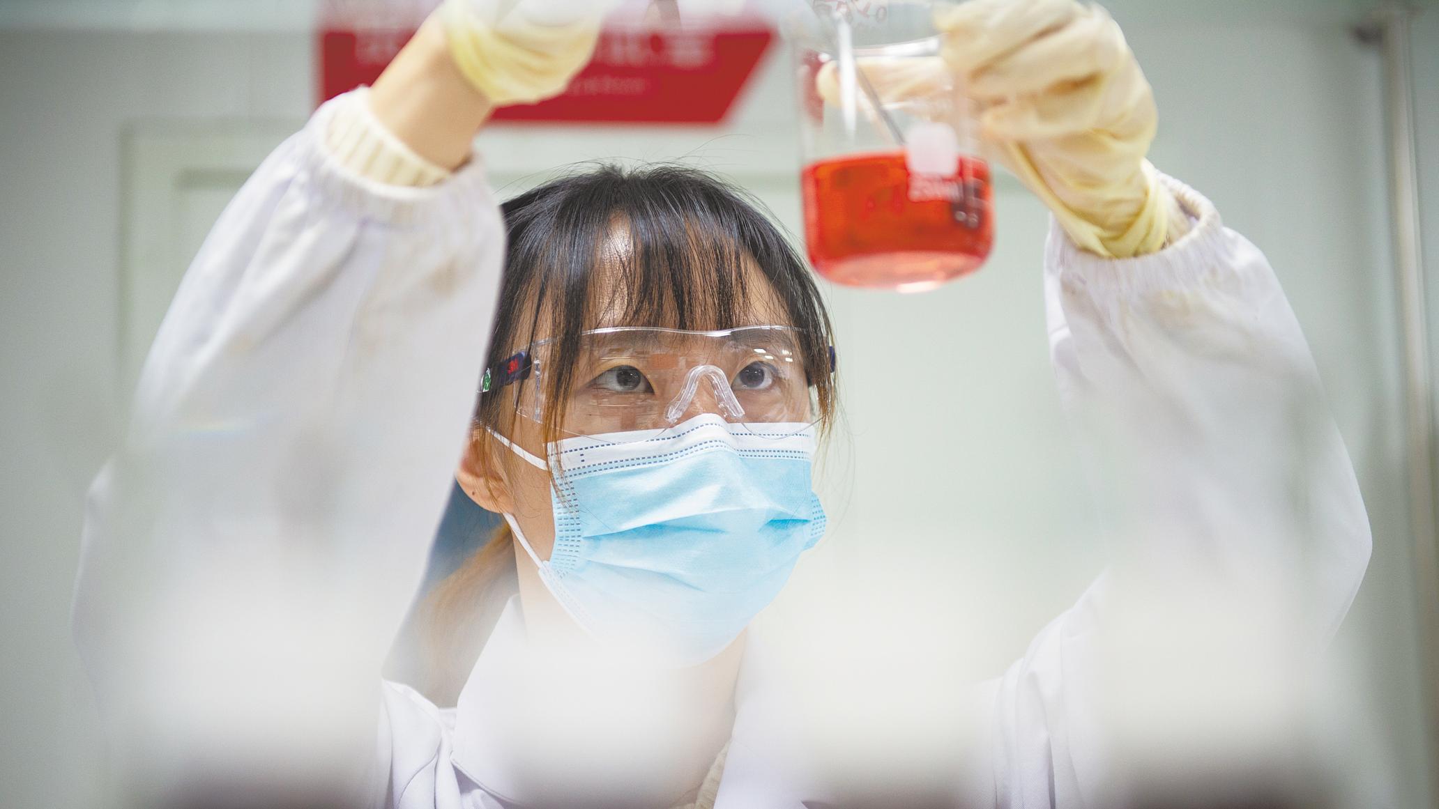 2021年10月26日,良品铺子研发人员在实验室调配食品配方。
