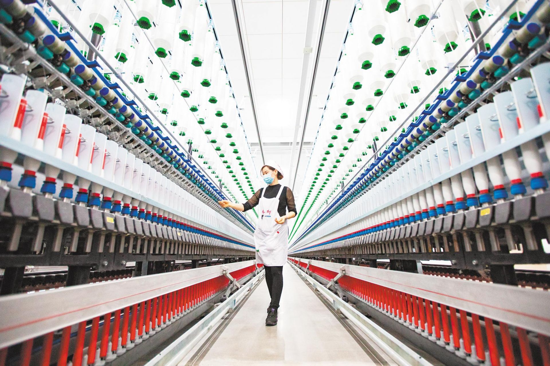 湖北枫树线业有限公司生产车间,工人在智能化生产线上作业。