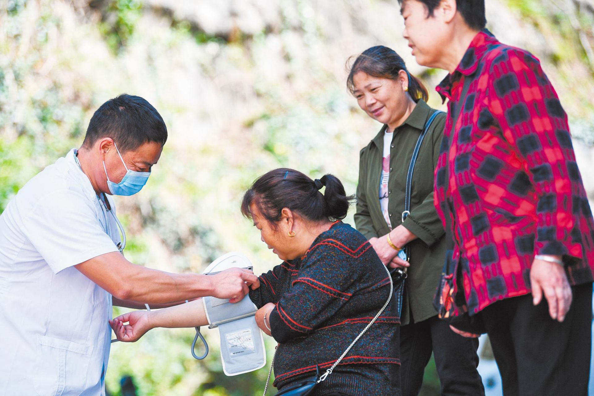 十堰张湾区岔河村大学生村医彭宝强在巡诊。彭宝强学医多年,深受村民信任。