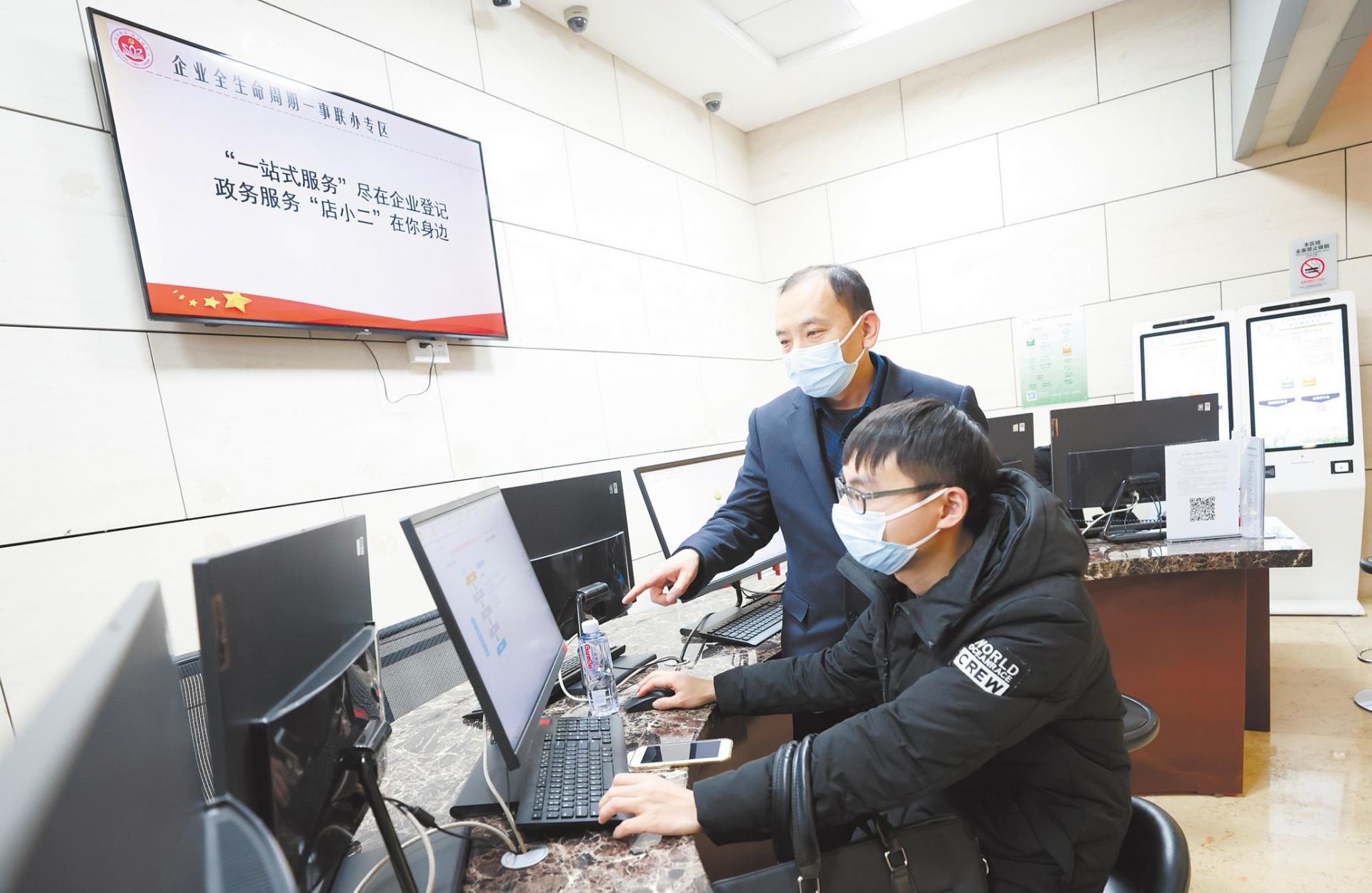 武汉经开区政务服务中心,“店小二”帮助市民进行企业开办登记。