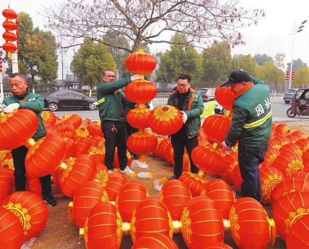 挂灯笼迎新春,是中国的传统习俗,灯笼象征着平安祥和、事业兴旺、红红火火。为了让市民度过一个美丽、祥和、喜庆的春节,市园林部门自1月19日起,在随城迎宾大道两侧悬挂灯笼,迎接农历新年的到来。图为园林工人正在组装灯笼。