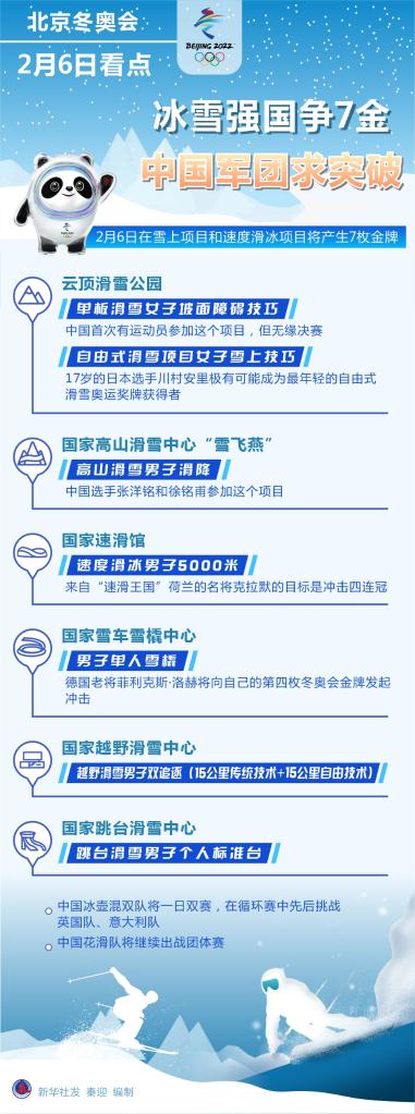 新华社北京2月5日电(记者 张泽伟)北京冬奥会6日在雪上项目和速度滑冰项目将产生7枚金牌,这是欧美国家的强项,激烈争夺在所难免;对中国军团来说,不少项目是首次参赛,目标是寻求突破。