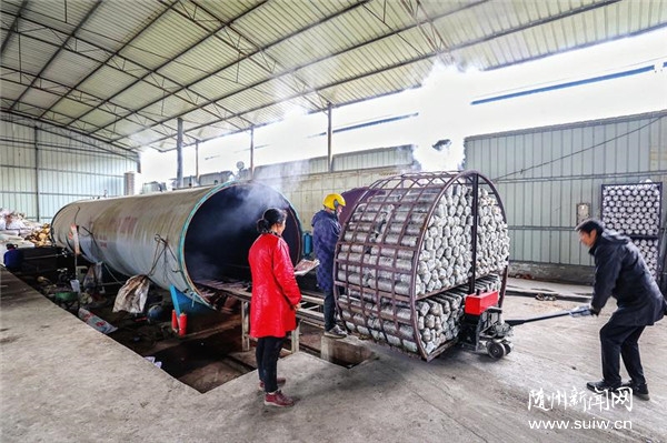 曾都区洛阳镇九口堰富民蘑菇农民专业合作社,通过引进自动装袋机和木材蒸煮罐等新装备,实现自动化集中制棒和规模化蒸煮消毒杀菌。图为该合作社春节后迅速复工,为袋料香菇棒进行集中装罐蒸煮消毒杀菌。(随州日报全媒记者 李文军摄)
