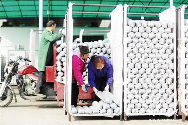 随县高城镇炎顺香菇产业园是该镇返乡创业人创办企业,总投资8600万元,年创产值1.2亿元,致力打造集制棒、种植、研发、深加工、互联网+销售于一体的香菇产业中心。图为工人们正在装运菌棒。 (随州日报全媒记者李文军、通讯员张玉国摄)
