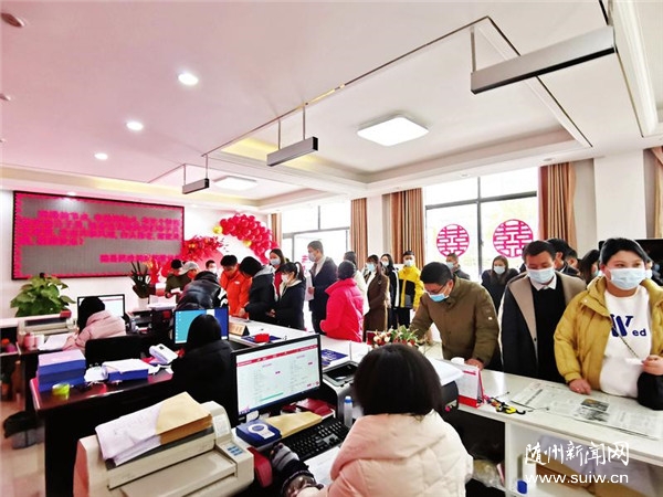 2022年2月22日被网友称为“有爱的日子”,许多新人选择在这一天登记结婚。随县婚姻登记处以此为契机,精心打造温馨宣誓大厅,开展文明婚俗改革宣传。 (随州日报全媒记者包东流、通讯员熊小琼摄)