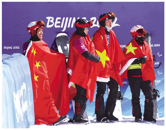四面五星红旗分别披在四位选手身上,他们享受着来自场内四面八方的欢呼。他们的名字是纪立家、王鹏耀、朱永钢、张义琦,他们是北京冬残奥会残奥单板滑雪男子障碍追逐UL级比赛大决赛的全部四名参赛选手,冠亚季殿军获得者。