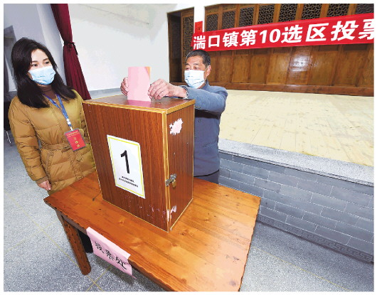在设在浙江省杭州市临安区湍口镇迎丰村的一个基层人大换届选举投票站,村民在参加投票,村级监察联络员监票(2021年12月14日摄)。 新华社记者徐昱摄