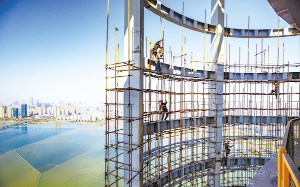 3月9日,武汉中北路襄阳大厦项目,中建三局工人在距离地面230多米高的钢结构上安装脚手架。 该项目建筑高度263.6米,是武昌区金融主轴项目的核心项目。目前项目主体结构封顶,正在加紧进行玻璃幕墙安装和内部精装修,计划今年下半年竣工投用。(湖北日报全媒记者 柯皓 通讯员 张世宇 刘紫荆 摄)