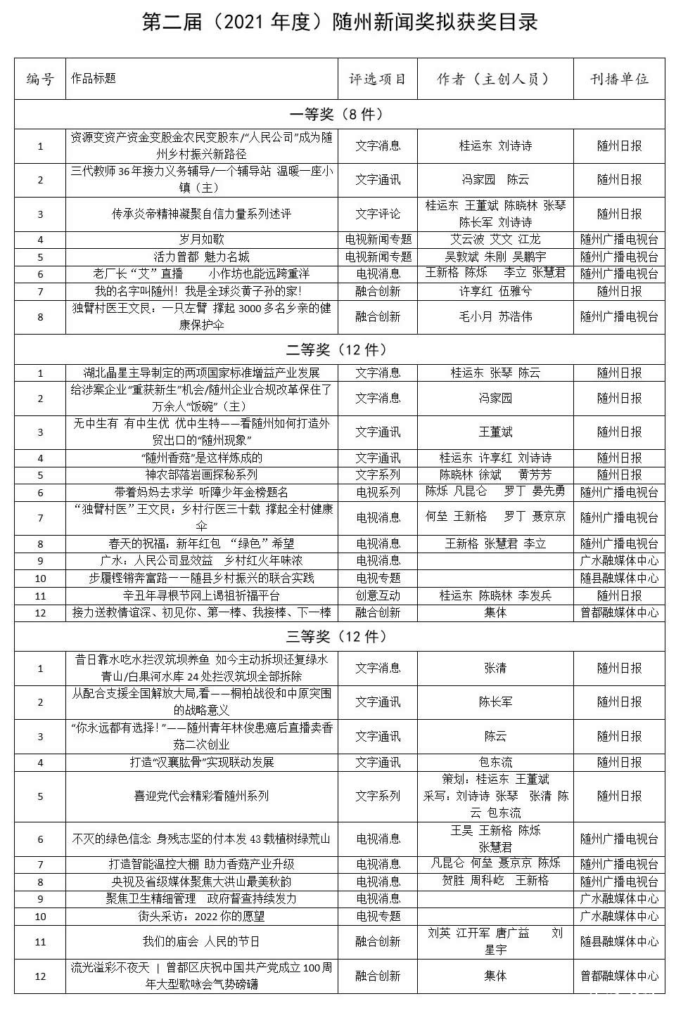 2022年3月15日至18日,第二届随州新闻奖评选会召开,评委专班通过自评、集中评的形式,共评出拟获随州新闻奖作品32件,其中一等奖8件,二等奖12件,三等奖12件。