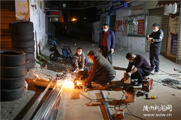 将焊接好的大门装上框架,铺上蓝色铁皮……凌晨1时许,花溪南巷的蓝色围挡设置完毕,为小区居民筑起安全“防护墙”。