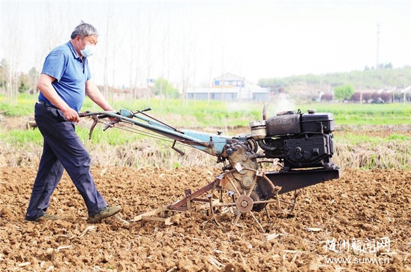 高城镇七里塔村村民何高云正在用手扶拖机为刚播种的玉米地耙平保湿。