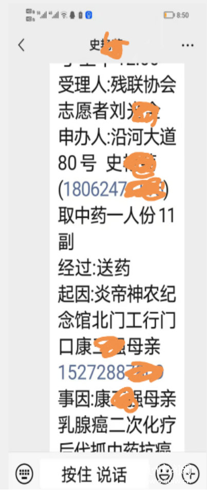 “能帮我将亲戚代抓的中药送到我家里来吗?”4月5日,随县癌症患者康某抱着试试看的心态在群里求助。了解情况后,市心连心志愿者协会副会长刘光全和志愿者汤旭涛立即开车赶至沿河大道一药店取药,并送到康某手里。