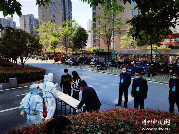 根据责任分工,大家各司其职、各尽其责。熟练地拉起警戒线,快速在地上贴上一米间隔线,布置好核酸检测场地,另一组则和小区物业人员开启扫楼模式,挨家挨户敲门提醒居民下楼做核酸,确保不漏一户、不落一人。6点正式开始核酸检测。队员们积极引导群众有序排队、协助进行信息登记、扫码并耐心提醒居民做好个人防护。